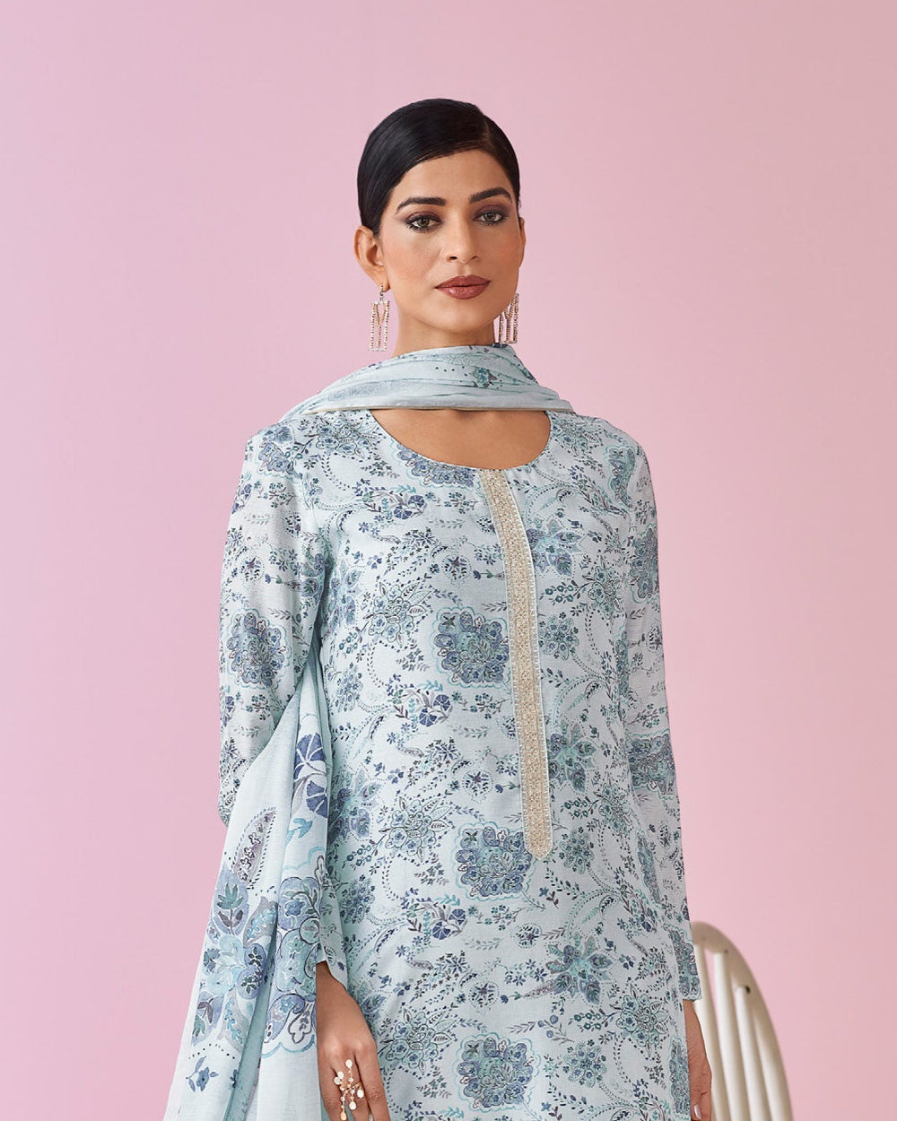 1923 - Elegant Blue Muslin Suit Set with Delicate Floral Print & Dupatta