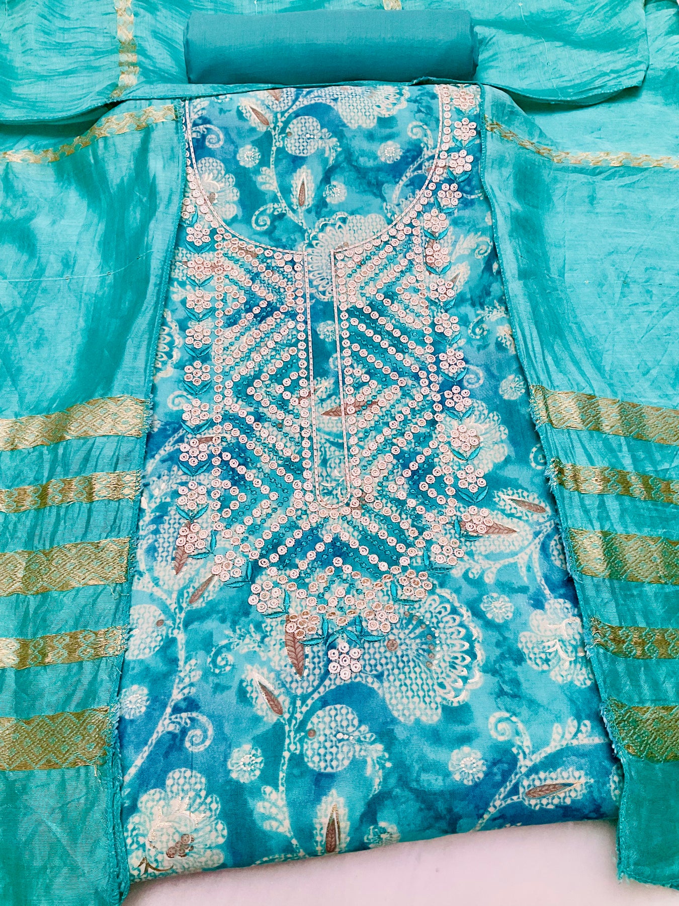 Elevate your ethnic wardrobe with this exquisite unstitched salwar suit set. Crafted with premium-quality, this set offers a beautiful blend of traditional elegance and modern charm.