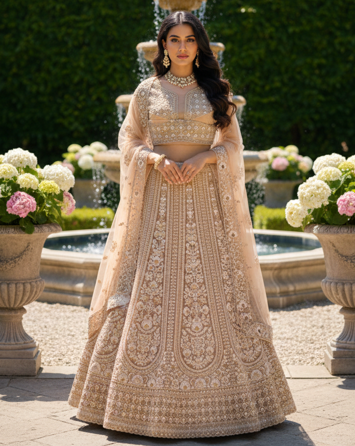 Zeenat – Beige Net Lehenga with Thread & Sequins Work, Embroidered Blouse & Net Dupatta | Fazals