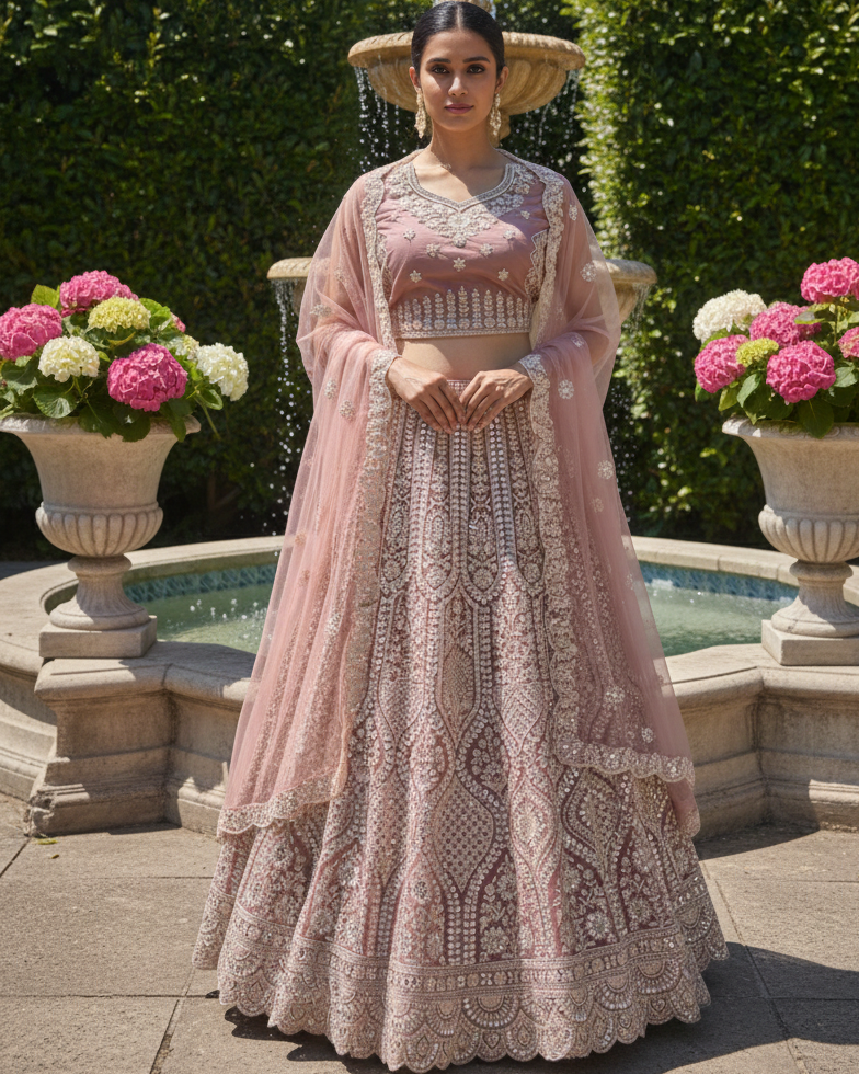 Aarohi – Dusty Pink Net Lehenga with Thread & Sequins Work, Embroidered Blouse & Net Dupatta | Fazals