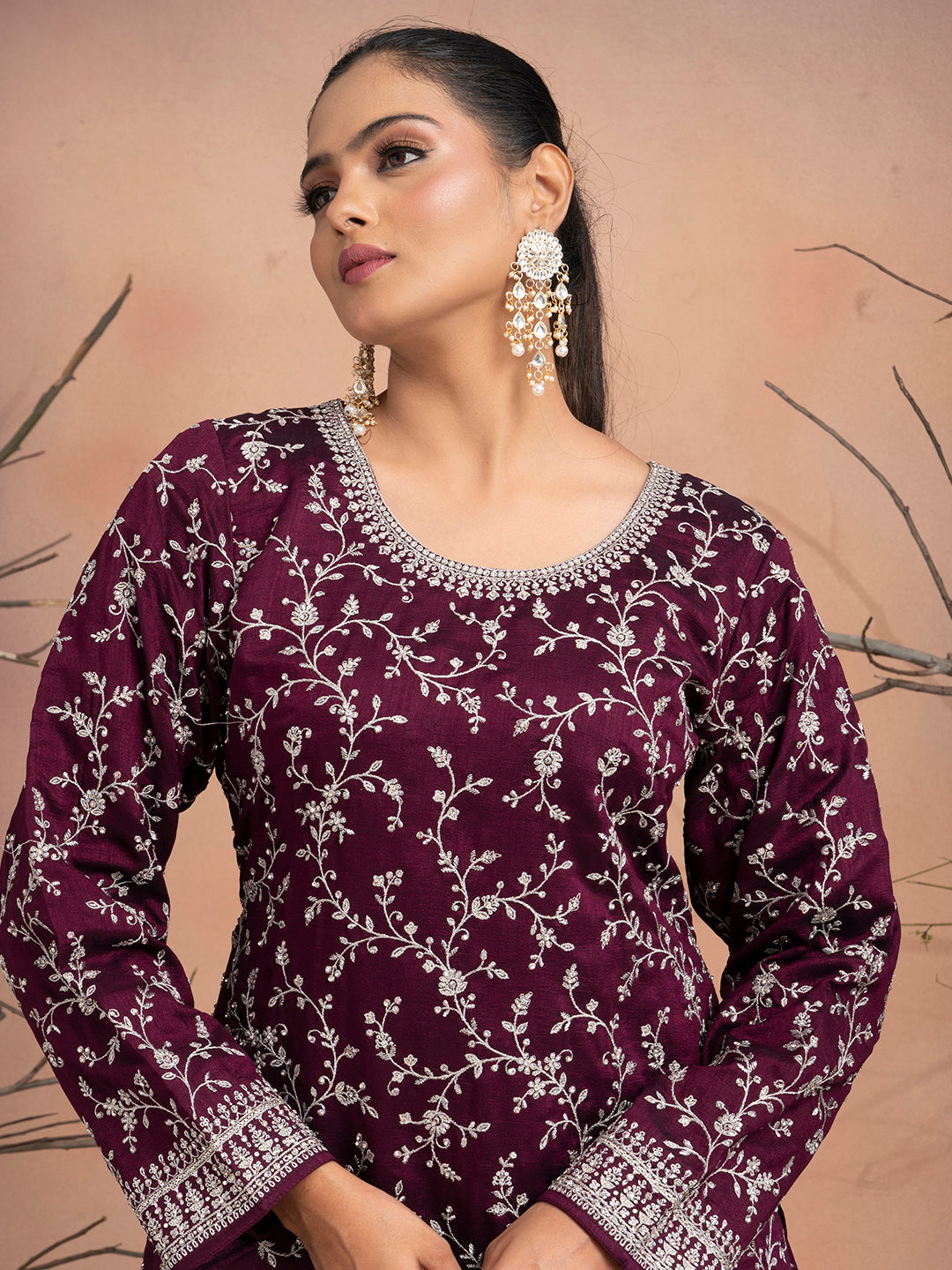 Husna – Wine Silk Palazzo Suit with Zari Embroidery | Fazals