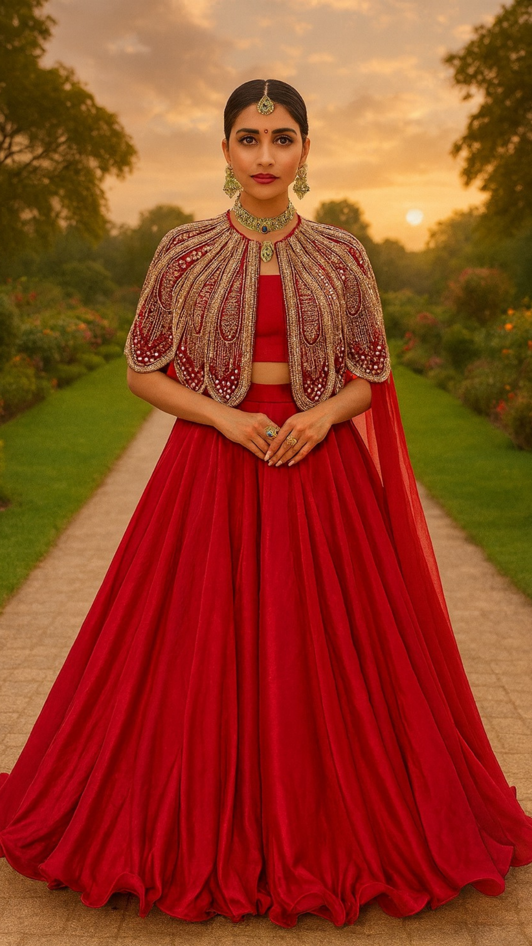 Zoya – Scarlet Red Cape Lehenga with Hand-Embroidered Beaded Detailing | Fazals