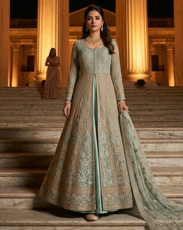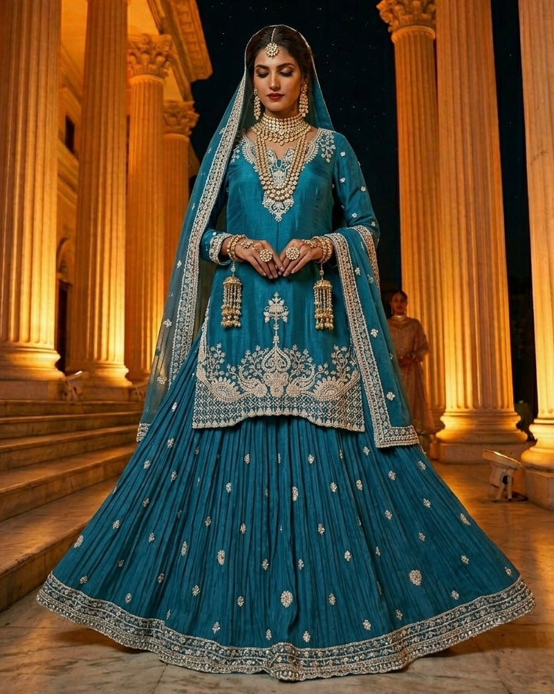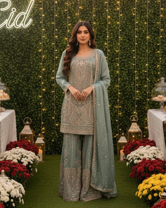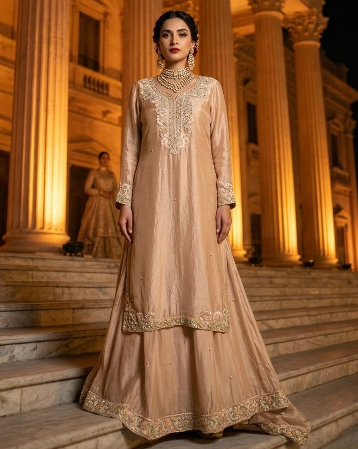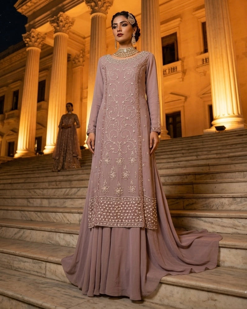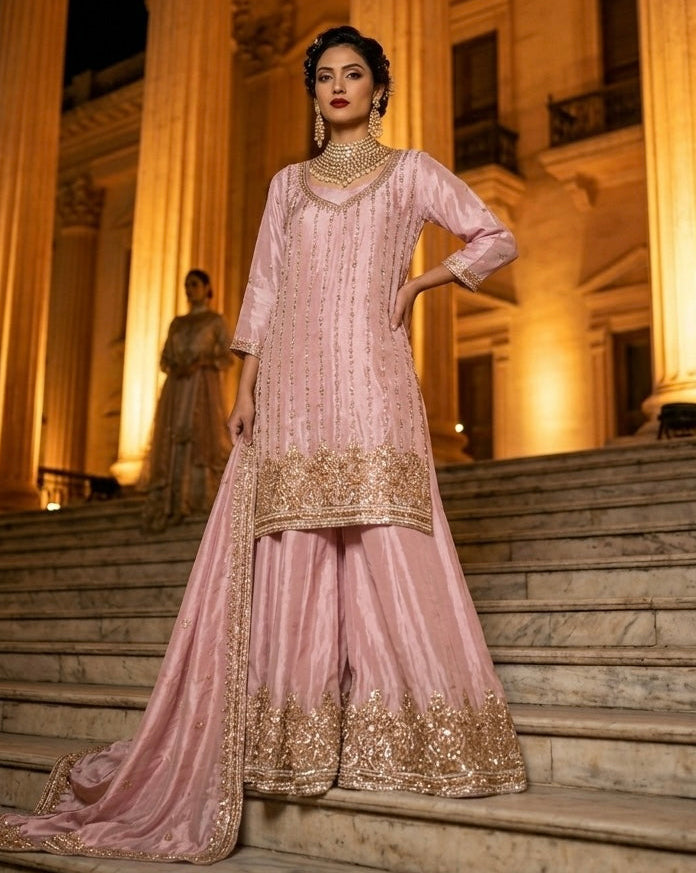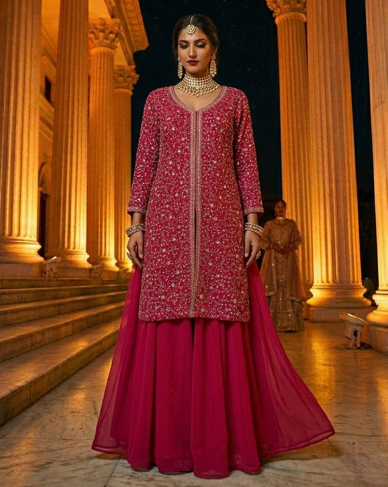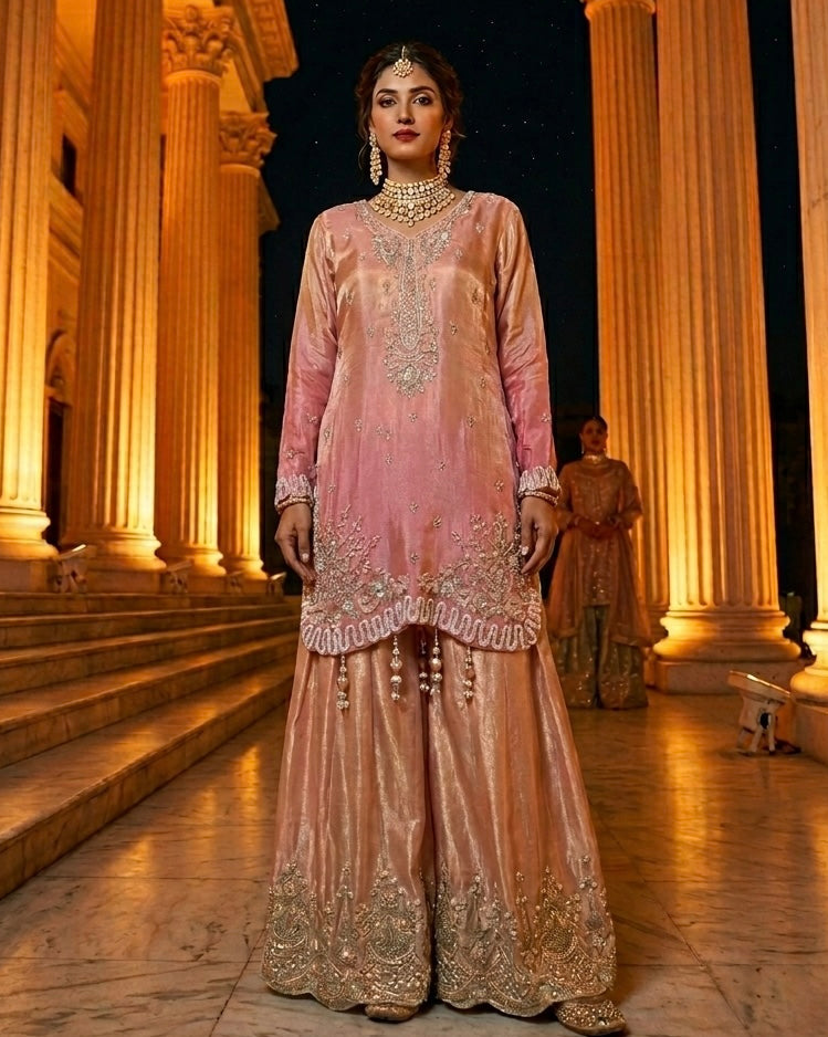 - Sharara Suits — Timeless flared bottoms with richly embellished kurtas, perfect for festive occasions