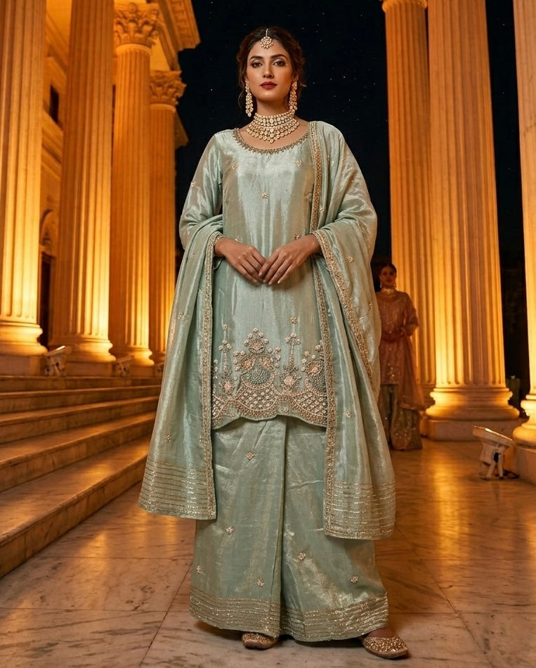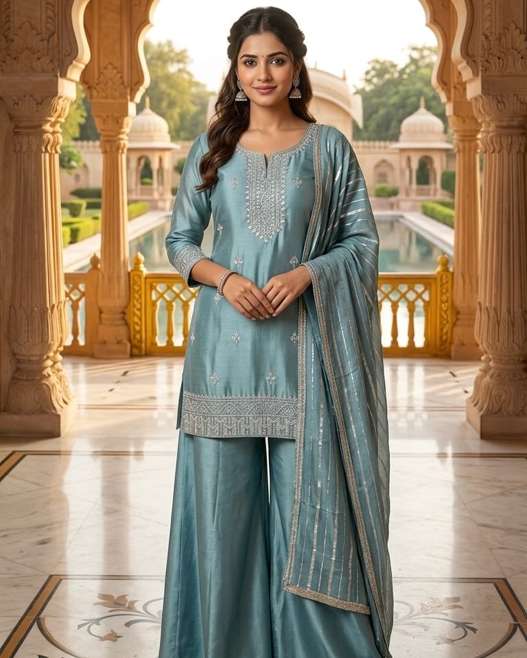 - Plazo Suits — Flowy, relaxed silhouettes paired with wide-leg palazzos for comfort and grace