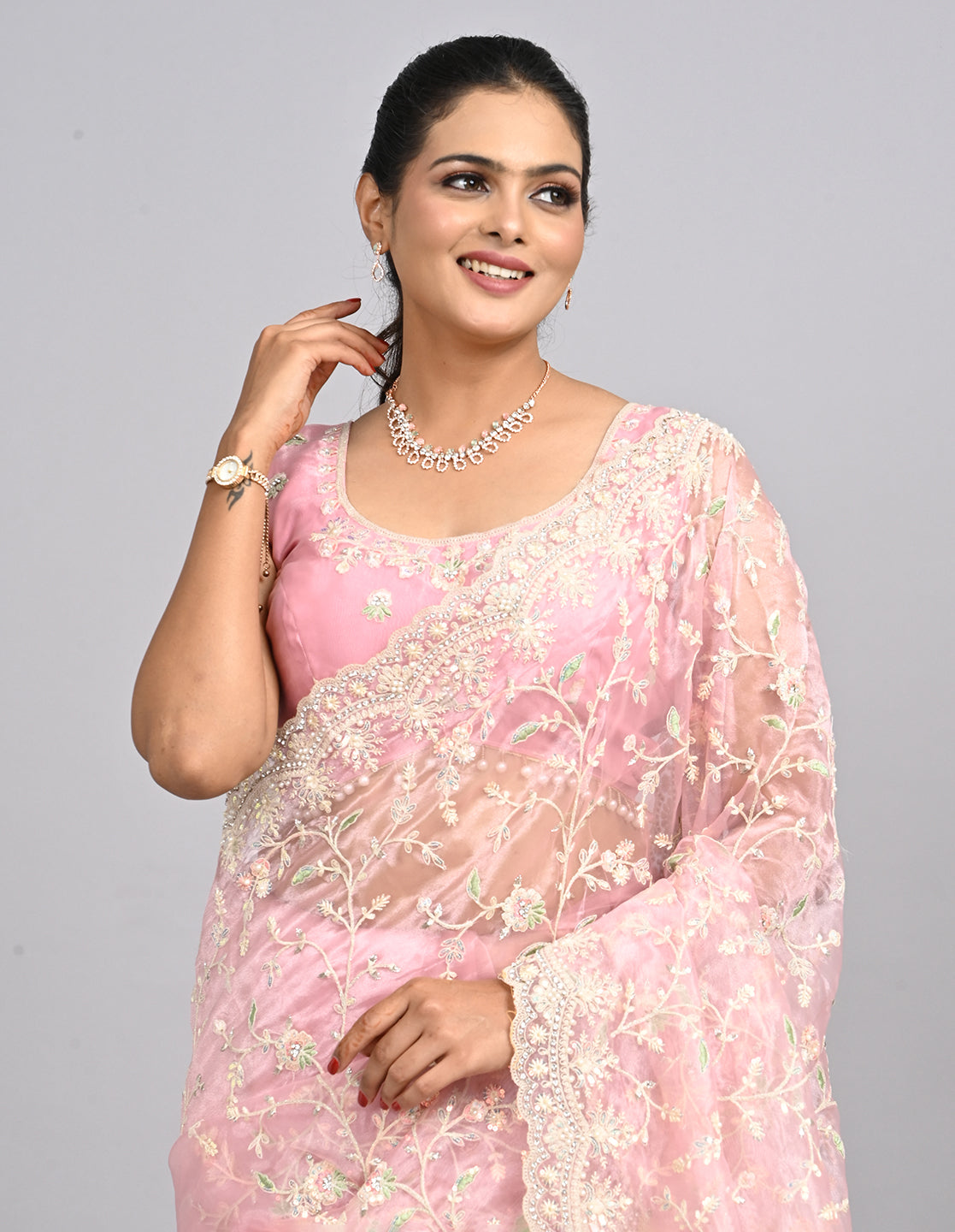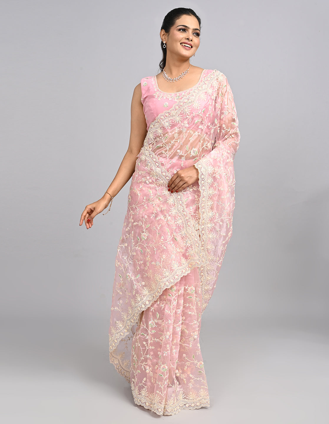 Ayla – Blush Pink Organza Saree with Thread & Stone Embroidery | Fazals
