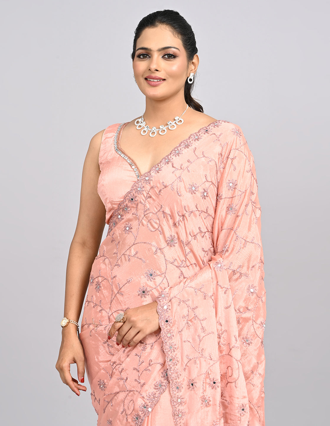 Meher – Peach Organza Saree with Coding & Mirror Work | Fazals