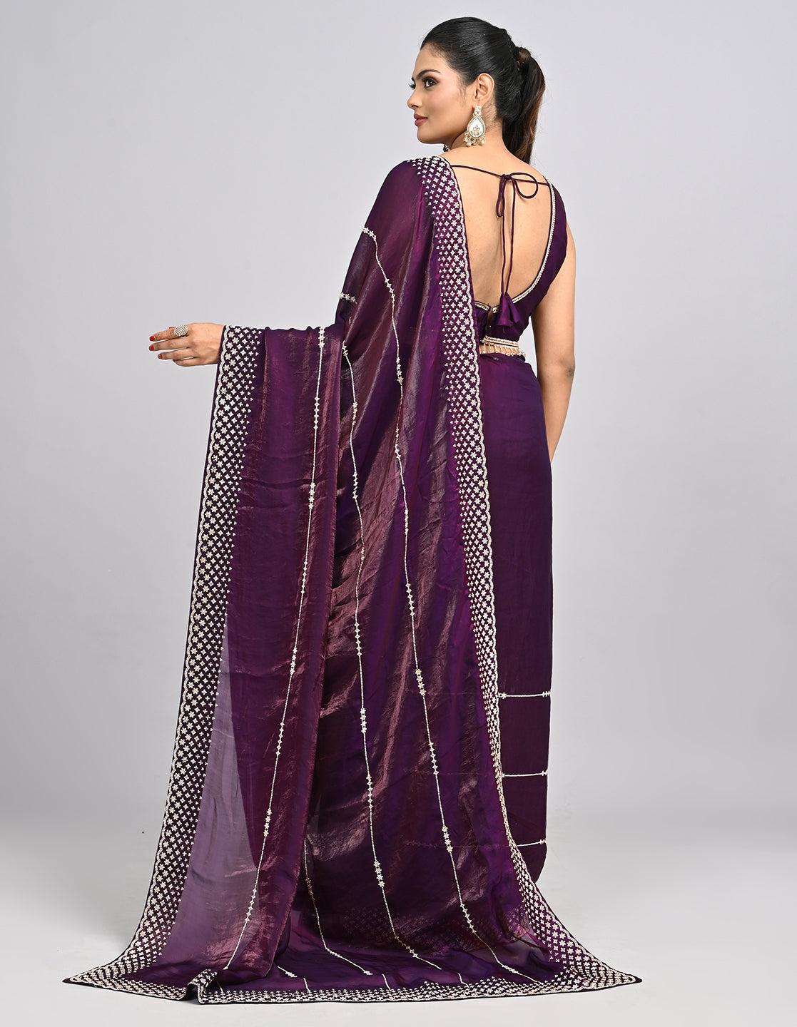 Mehr – Wine Organza Saree with Stonework & Self-Coloured Blouse | Fazals