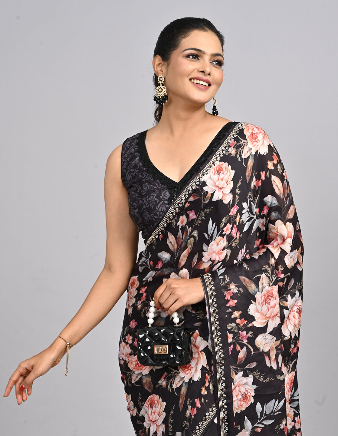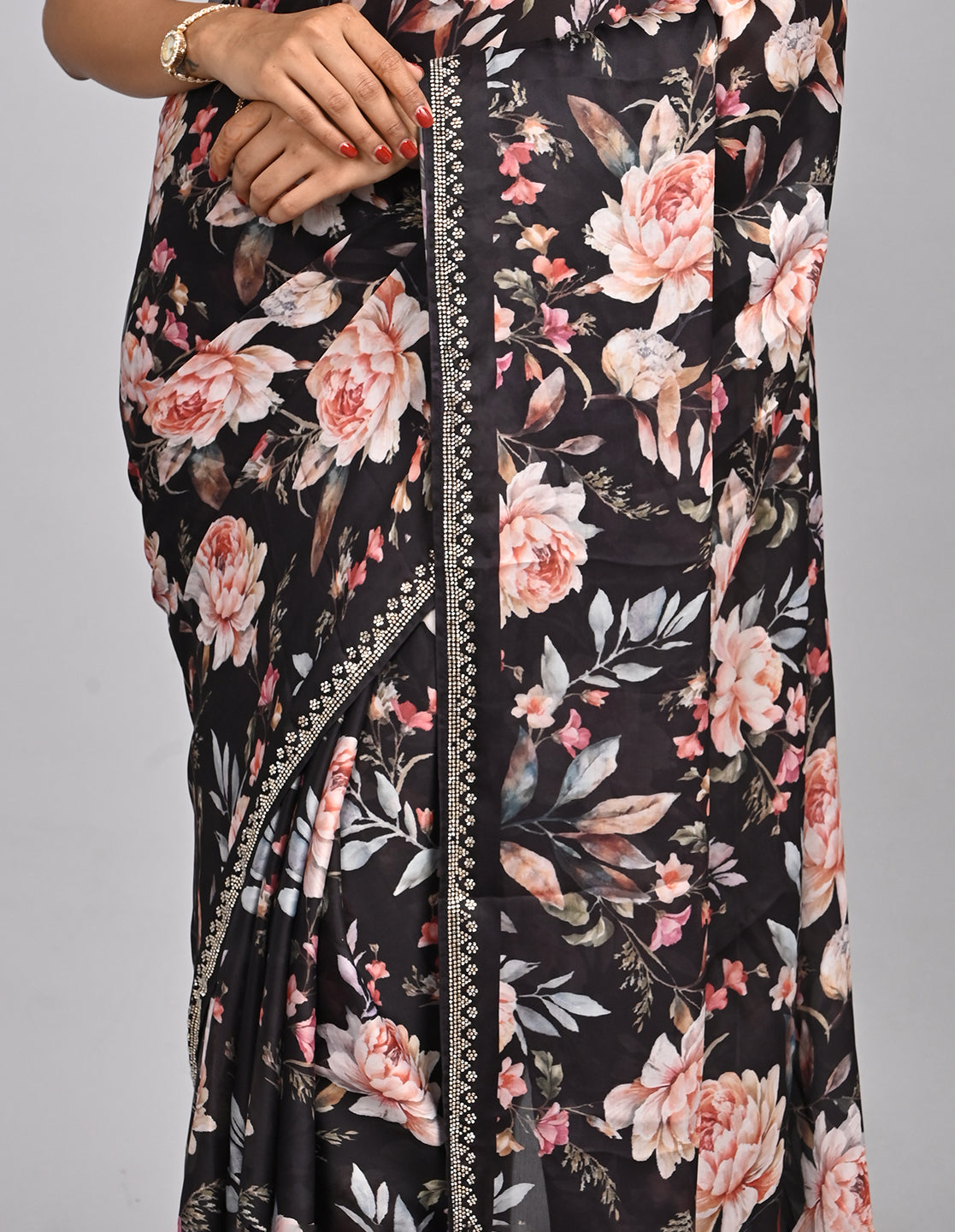 Noor – Black Floral Satin Saree with printed Blouse | Fazals