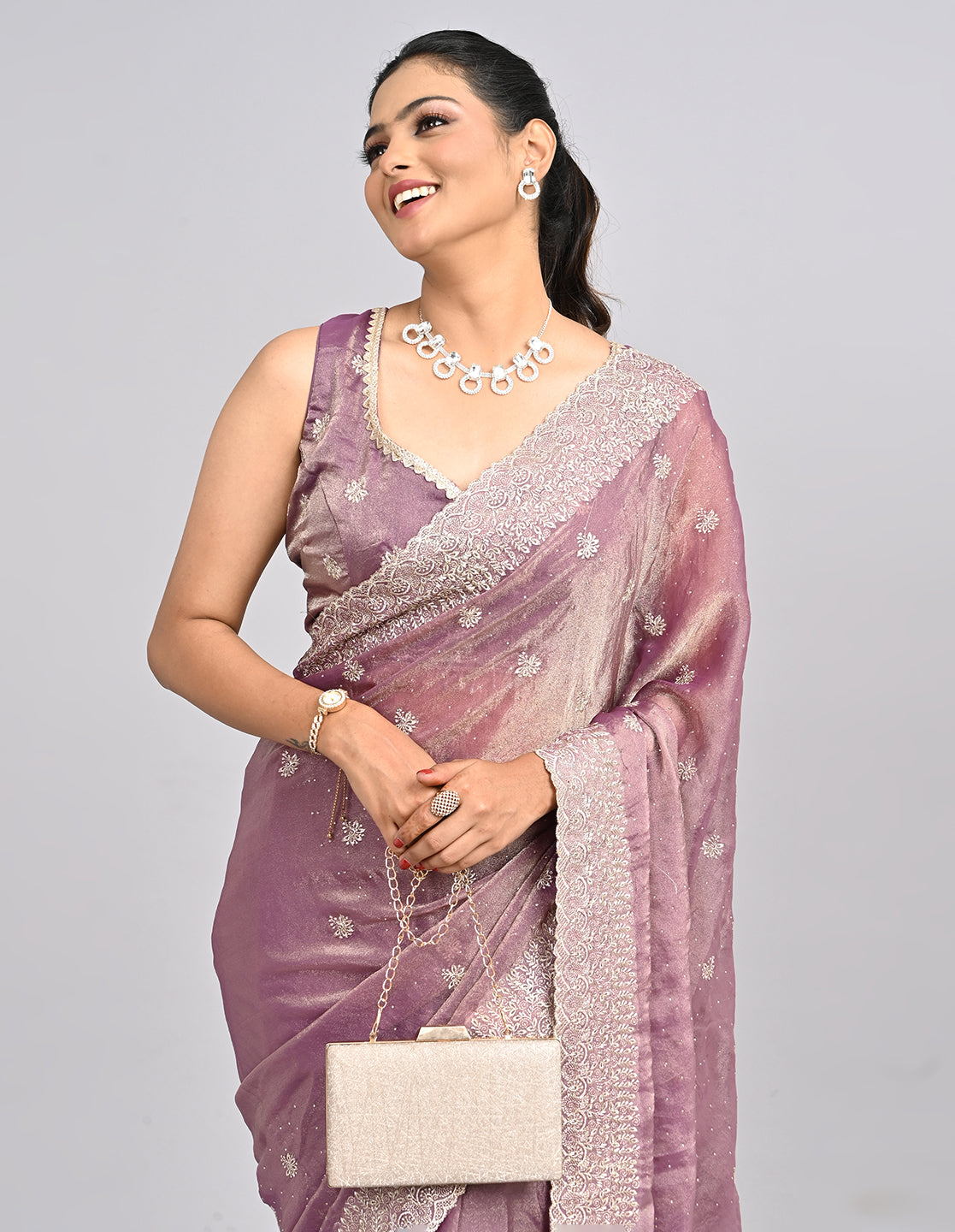 Style Tip: Complement with antique gold or pearl jewellery, soft pink-toned makeup, and a sleek bun or side waves for a timeless appeal.