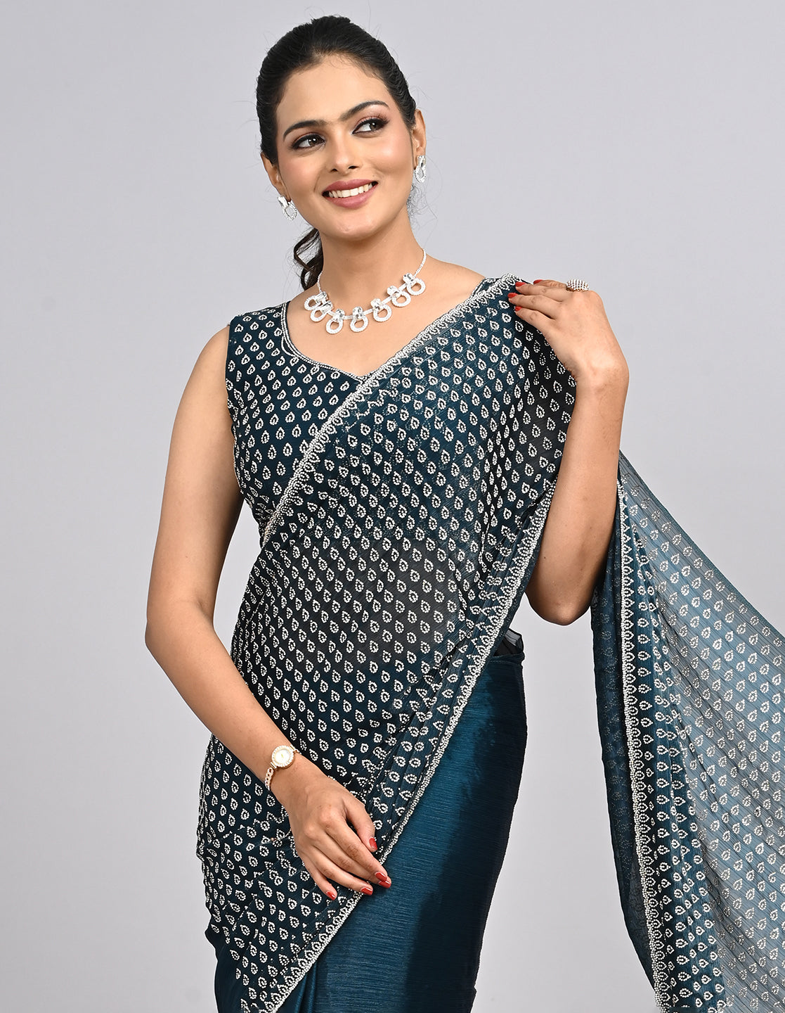 Shanzay – Blue Chinnon Saree with Stonework & Self-Coloured Blouse | Fazals