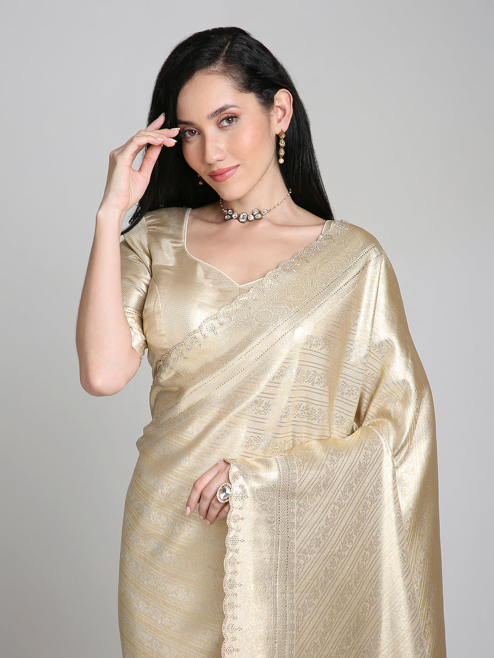 Styling Note: The blouse lace detailing shown in the image is only for styling purposes and is not included. The saree comes with a matching gold silk blouse fabric (unstitched).