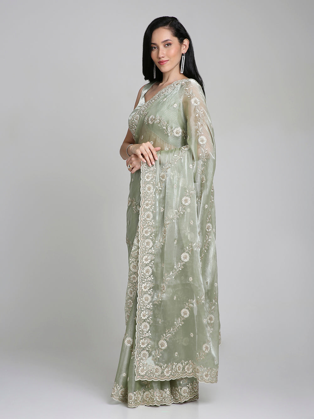 Ishira – Sage Green Embroidered Chiffon Saree with Pearl Lace Border | Fazals