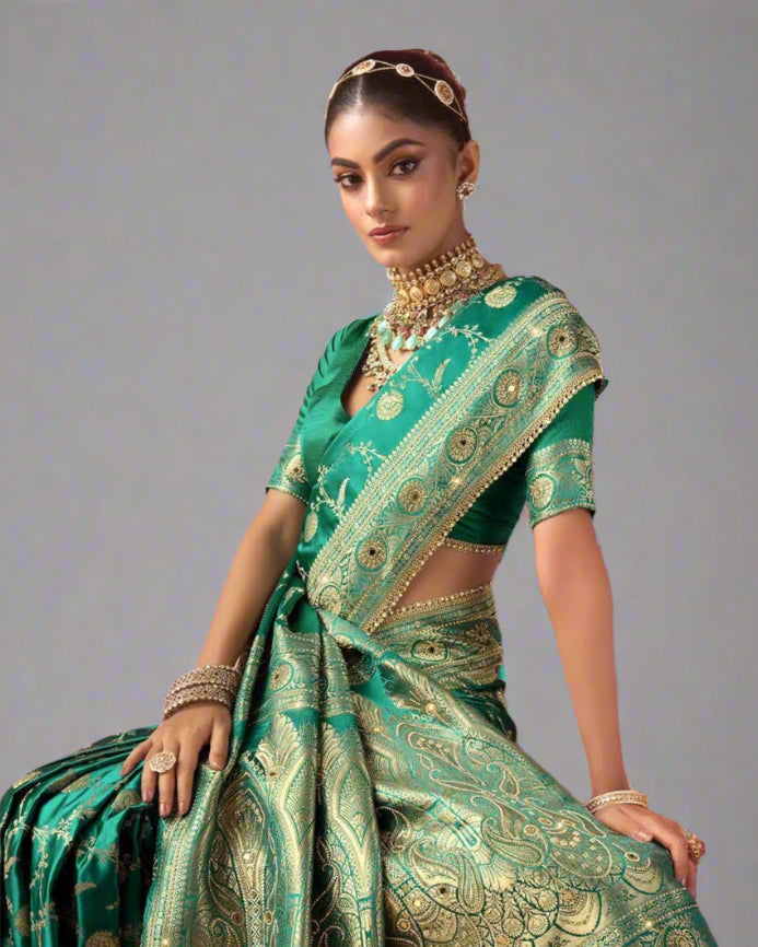 Ishita – Emerald Green Banarasi Silk Saree with Swarovski & Zari Work | Fazals