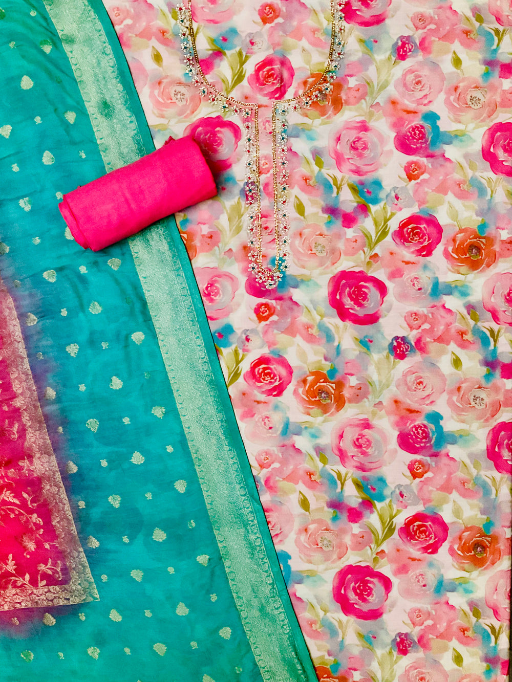 Elevate your ethnic wardrobe with this exquisite unstitched salwar suit set. Crafted with premium-quality, this set offers a beautiful blend of traditional elegance and modern charm.